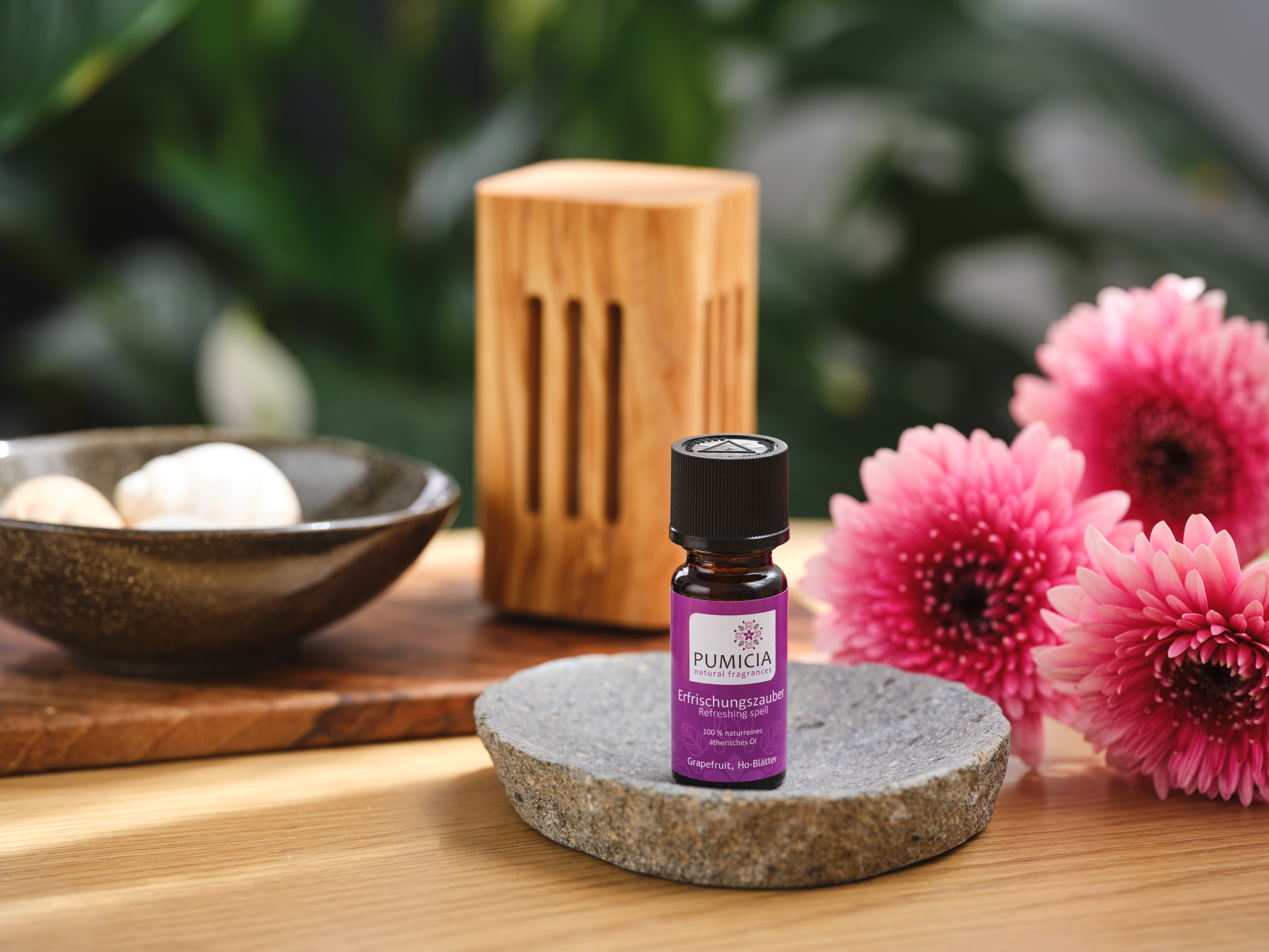 Die Duftkomposition „Erfrischungszauber“ mit Grapefruit und Ho-Blättern bringt die spritzige Frische und natürliche Lebendigkeit eines sonnigen Morgens in Ihr Zuhause. Jeder Atemzug erinnert an belebende Zitrusnoten gepaart mit einem Hauch grüner Frische. Der Duft wirkt erfrischend und klärend, schenkt neue Energie und unterstützt die Konzentration.