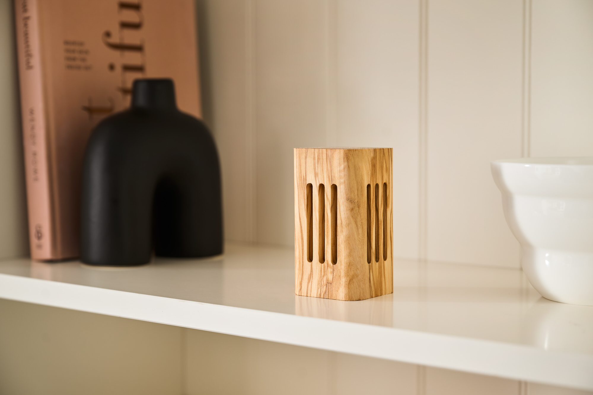 Den Olivenholz Diffusor gibt es in 2 Formen, in eckig und rund. Alternativ