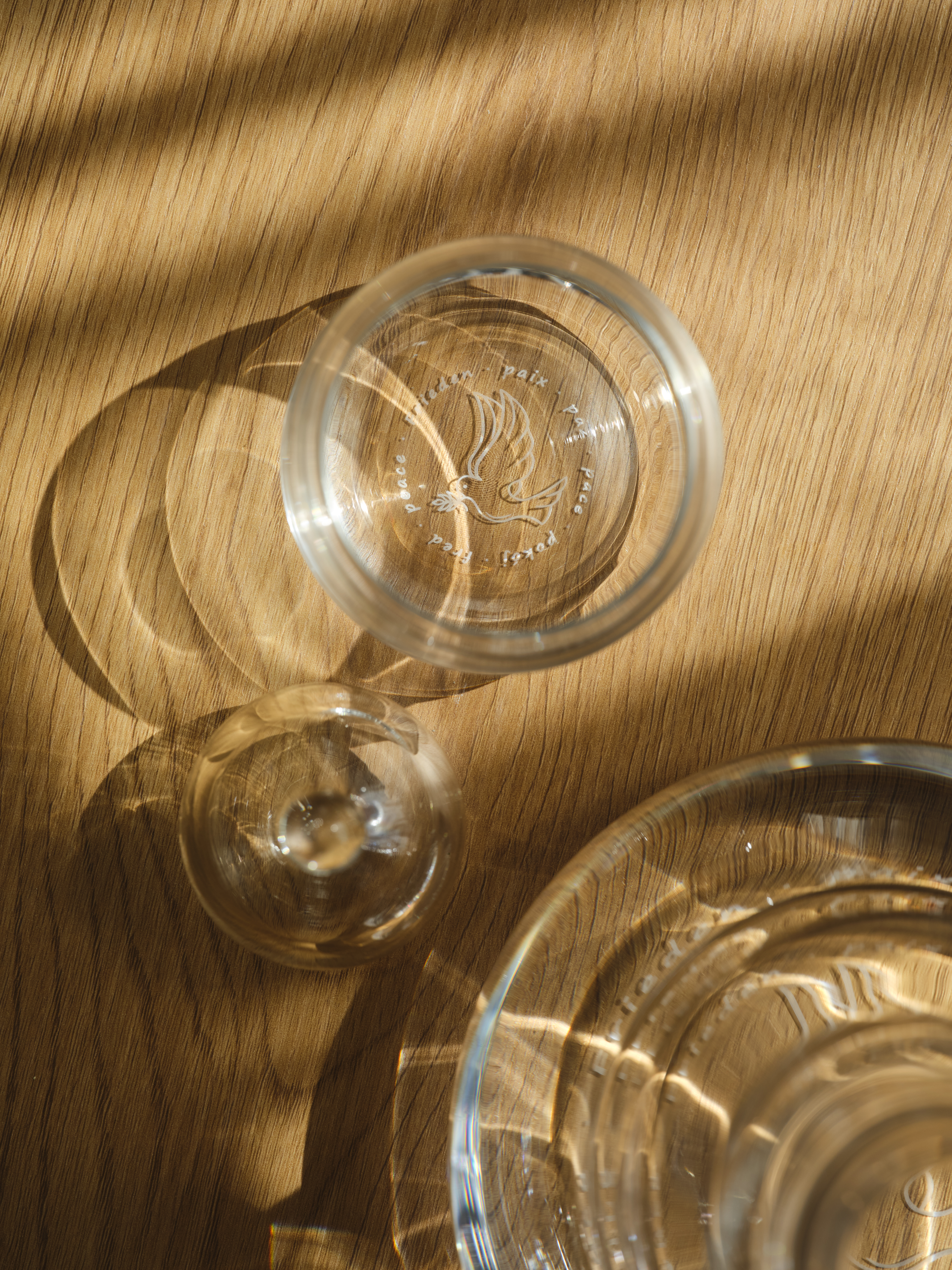 Die Sonderedition geht jedoch noch einen Schritt weiter: Im Boden jedes Glases ist die Friedenstaube eingraviert, umgeben vom Wort Frieden in sieben Ausführungen, aus denen sich in elf Sprachen – darunter deutsch, englisch, norwegisch, schwedisch, dänisch, italienisch, portugiesisch, polnisch, spanisch, rumänisch und französisch - das Wort "Frieden" formt. Ein stilles Statement, das verbindet – über Grenzen hinweg.