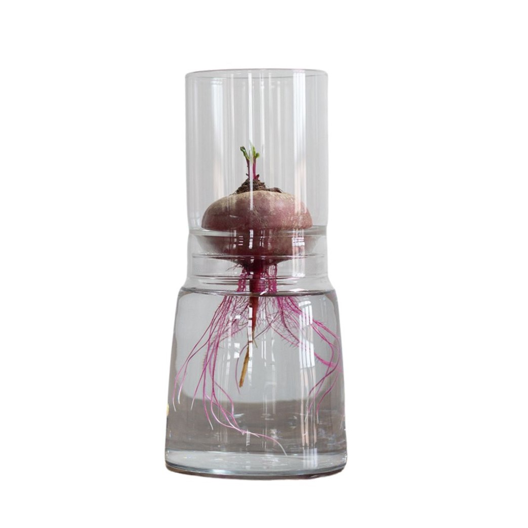 Viele kennen es noch von früher - das Hyazinthenglas (meistens aus Kunststoff). Das Glas war unser Ideengeber. Nach unseren Erfahrungen ist es allerdings unbedingt notwendig, das Glas teilbar zu machen, damit ein Nachgießen oder Wasserwechsel einfach händelbar ist. Der untere Teil des Anzuchtglas ist nach dem goldenen Schnitt gefertigt.