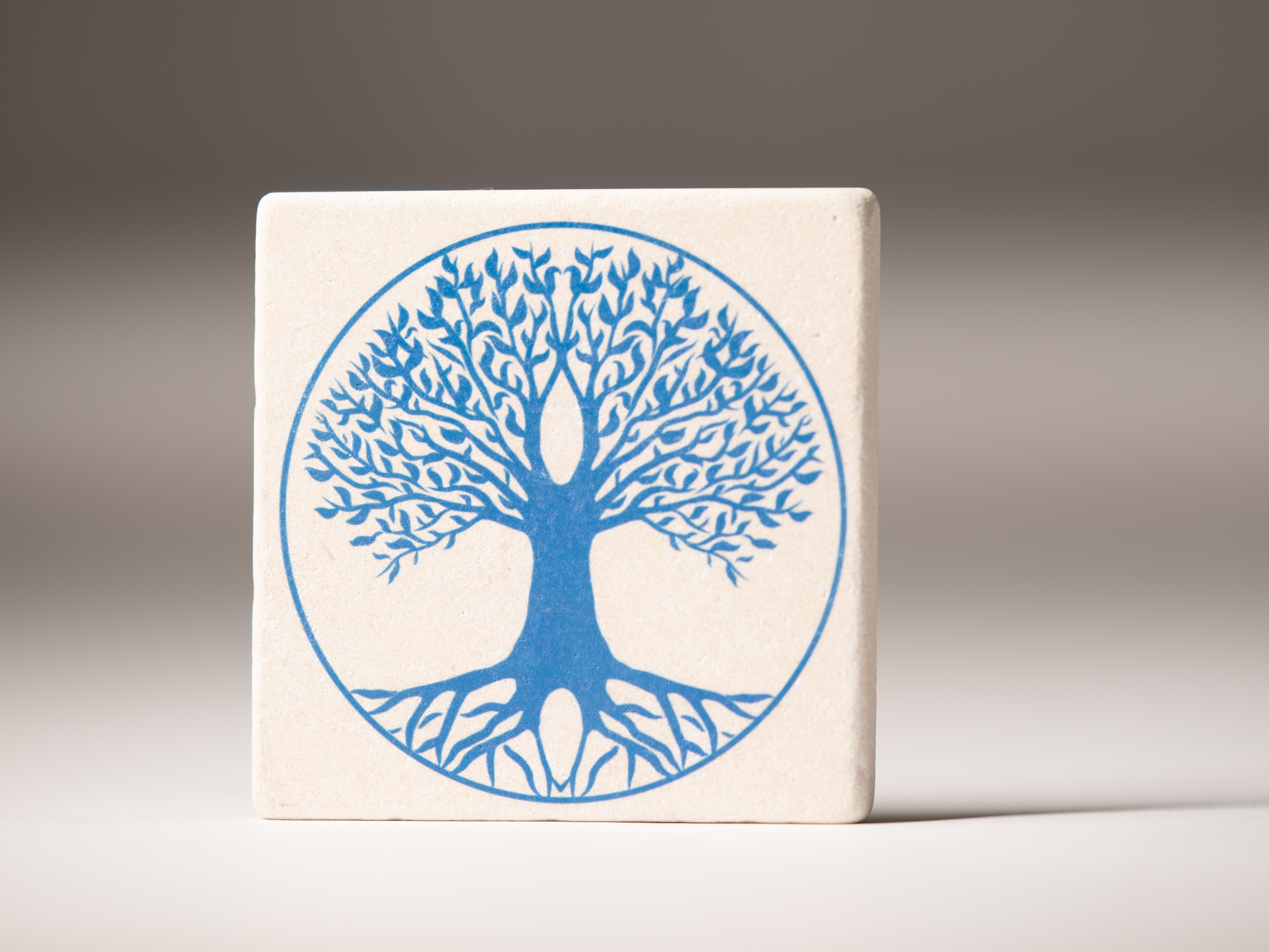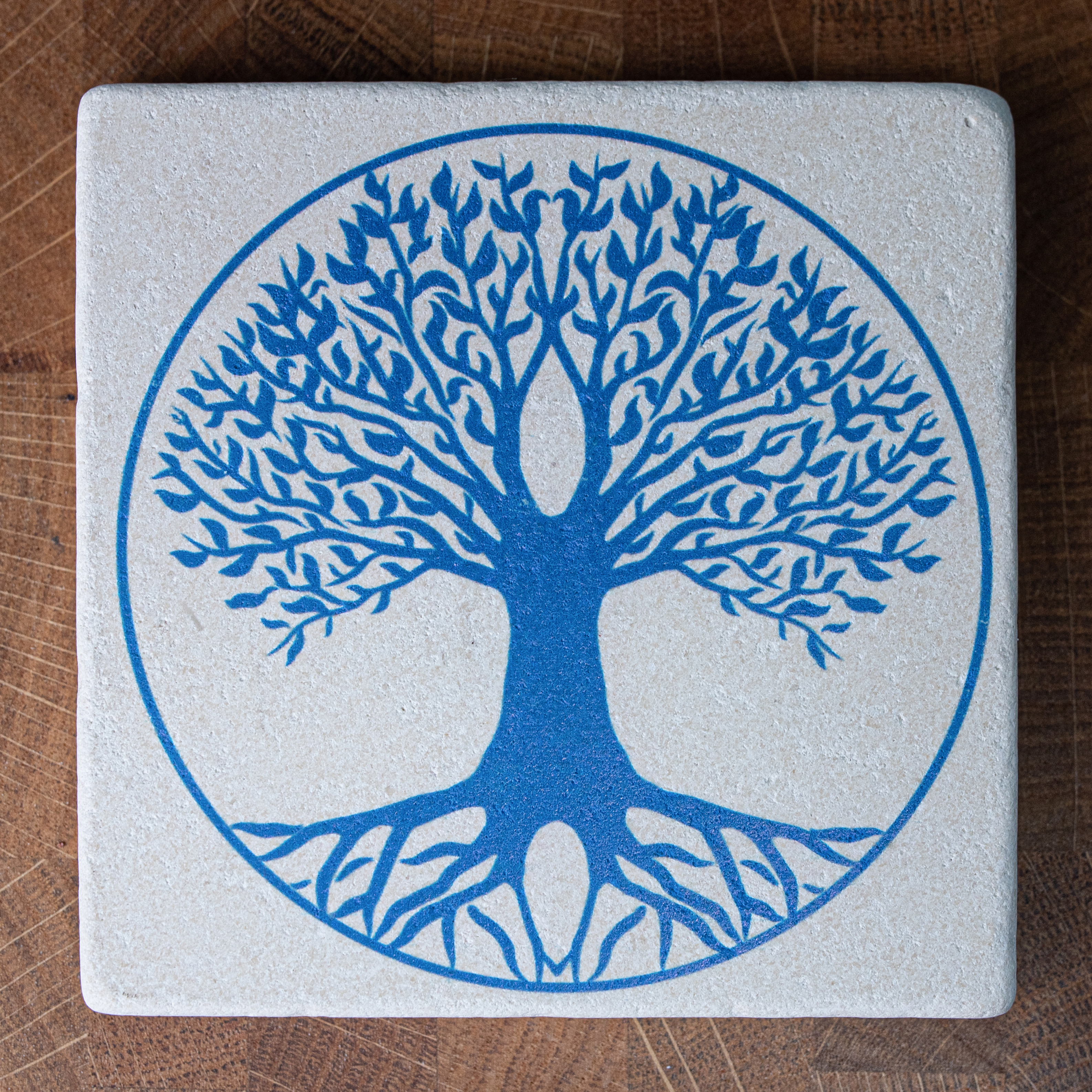 Produktinformationen "Travertin Untersetzer | Lebensbaum hellblau"